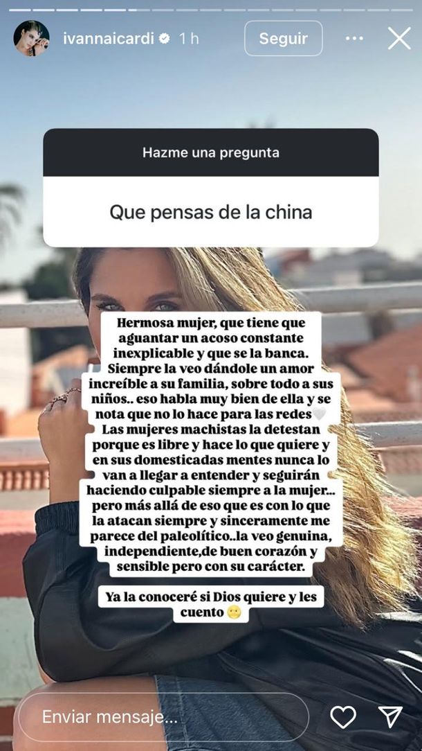Entre todas las dudas, una internauta le consultó: "¿Qué opinás de la China?", en referencia a Eugenia Suárez, actual pareja de su hermano. Ante esto, Ivana fue contundente y lanzó: "Hermosa mujer, que tiene que aguantar un acoso constante inexplicable y que se la banca. Siempre la veo dándole un amor increíble a su familia, sobre todo a sus niños. Eso habla muy bien de ella y se nota que no lo hace para las redes", comenzó indicando.