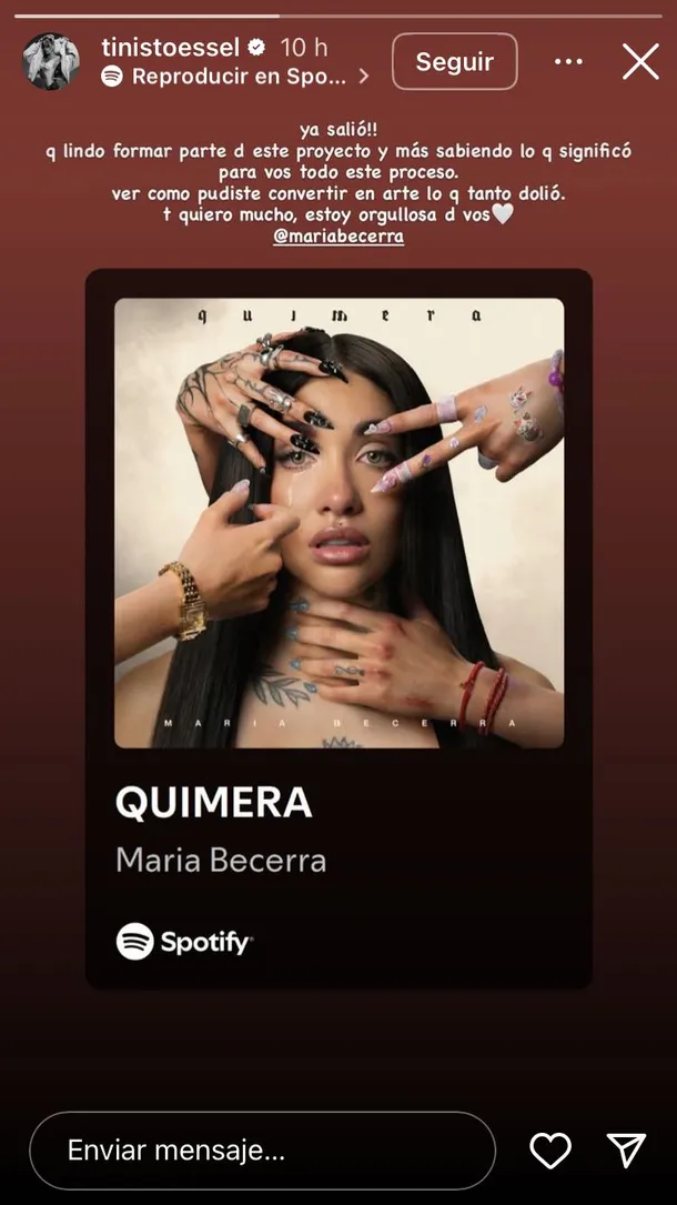 El reciente lanzamiento de Quimera, el nuevo álbum de María Becerra, generó una ola de reacciones en el mundo de la música latinoamericana. Entre ellas, Tini Stoessel se destacó al dedicarle un emotivo mensaje a Becerra a través de sus redes sociales, donde celebró la capacidad de su colega para transformar el dolor personal en arte y subrayó la importancia de su colaboración en la canción "Hasta que me enamoro".