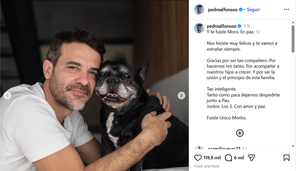 "Tan inteligente. Tanto como para dejarnos despedirte junto a Pau. Juntos. Los 3. Con amor y paz. Fuiste Unico Morito", cerró Pedro, en lo que sin dudas está siendo uno de los momentos más tristes para su esposa Paula, sus tres hijos y él.