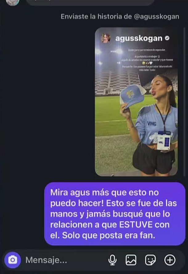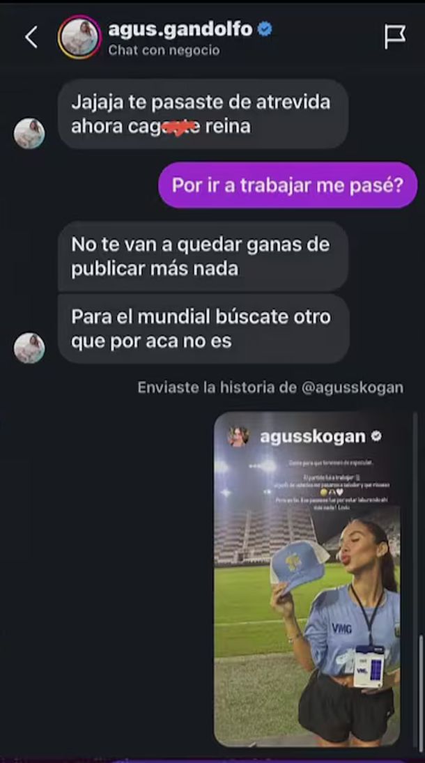 “Ja, ja, gato ridículo”, fue uno de los primeros mensajes que recibió Kogan, y el intercambio continuó con advertencias más intensas: “Te pasaste de atrevida. Ahora cagate reina. No te van a quedar ganas de publicar más nada. Para el Mundial, buscate otro que por acá no es”, leyó la joven en vivo durante el programa Puro Show.