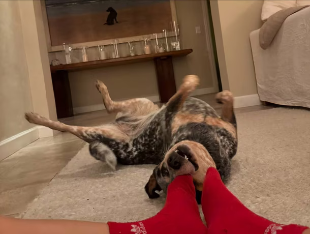 Las imágenes se presentan en el feed a mode de carrete sin una lógica aparente. En una, la joven aparece entrenando; en otra, un perro se revuelca despreocupadamente frente a sus medias. Luego, una toma mientras conduce; afuera, una nube —vista a través del vidrio— dibuja fugazmente la silueta de un caballo.