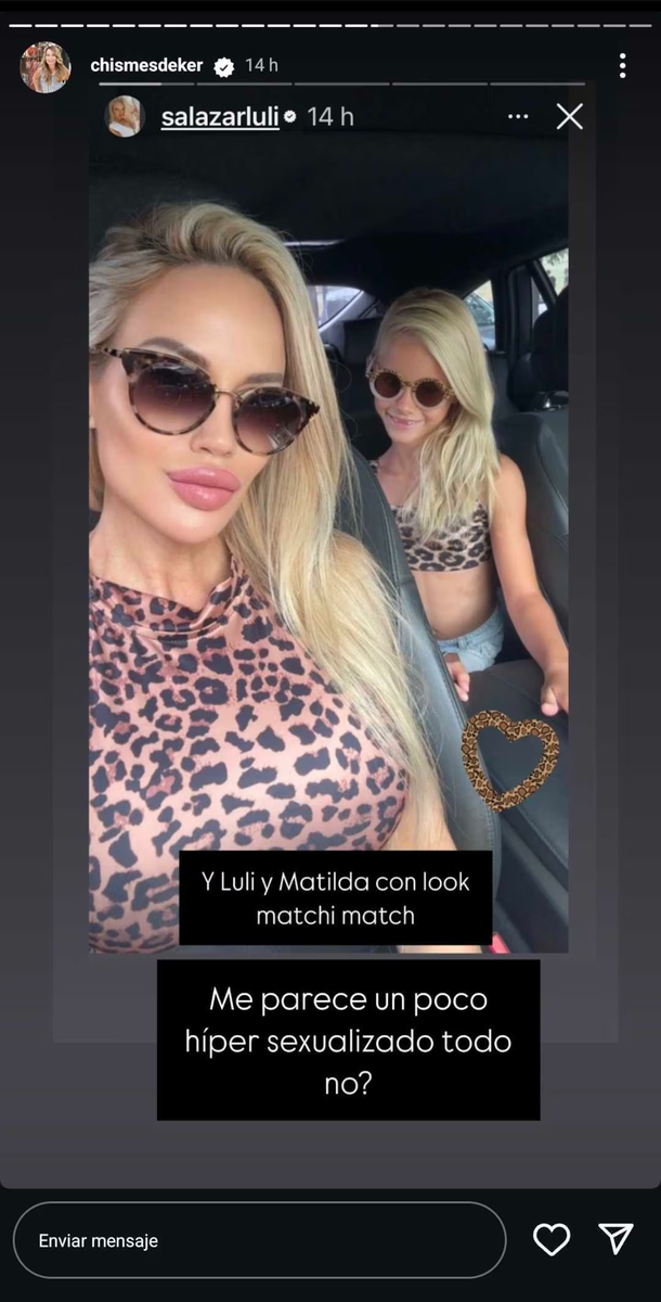 Luciana Salazar fue objeto de críticas en redes sociales después de publicar una serie de fotos en las que ella y su hija Matilda lucían conjuntos a juego con estampa animal print. Algunos usuarios consideraron que la elección de vestimenta no era apropiada para una niña de siete años y lo expresaron abiertamente en los comentarios.