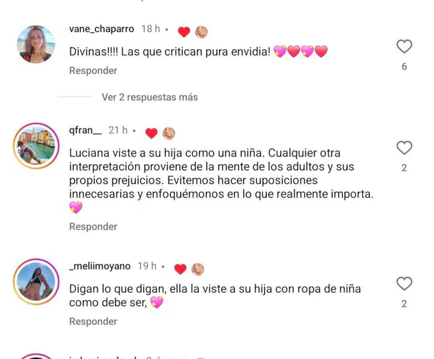"¡Divinas! Las que critican tienen pura envidia", expresó una usuaria. "La viste como a una niña. Cualquier otra interpretación proviene de la mente de los adultos y sus propios prejuicios", añadió otra persona. "Digan lo que digan, ella viste a su hija con ropa de niña como debe ser", comentaron también.