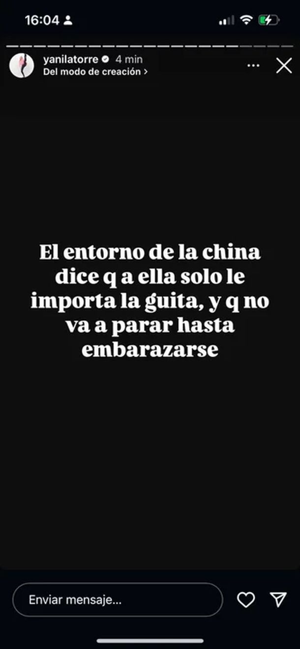 “El entorno de La China dice que a ella solo le importa la guita y que no va a parar hasta embarazarse”, escribió la panelista en sus redes sociales y agregó: “Esto a Wanda la tiene enloquecida”.