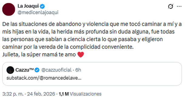 Como buena amiga que es, la referente de música urbana salió a defender a Cazzu, quien se portó muy bien con ella cuando tuvo que escapar de una vieja relación donde sufría violencia. Movida por el renacer de algunas sensaciones, La Joaqui expresó: "De las situaciones de abandono y violencia que me tocó caminar a mí y a mis hijas en la vida, la herida más profunda sin duda alguna, fue todas las personas que sabían a ciencia cierta lo que pasaba y eligieron caminar por la vereda de la complicidad conveniente".