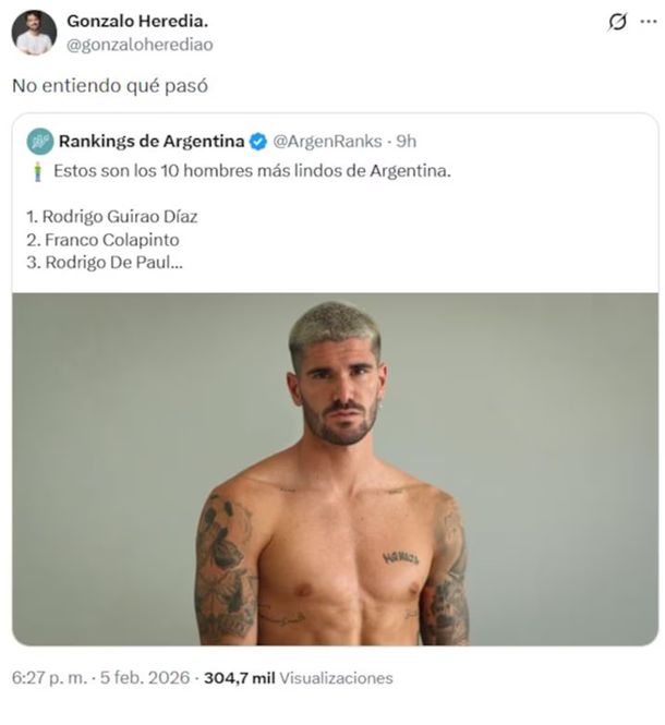 Como suele suceder con este tipo de publicaciones, la lista reavivó la polémica en redes sociales, con elogios, críticas al orden elegido y reclamos por otros nombres que no fueron contemplados. Entre memes y comentarios sarcásticos, los “excluidos” se ganaron un lugar central en la conversación, con Gonzalo Heredia como uno de los más mencionados.