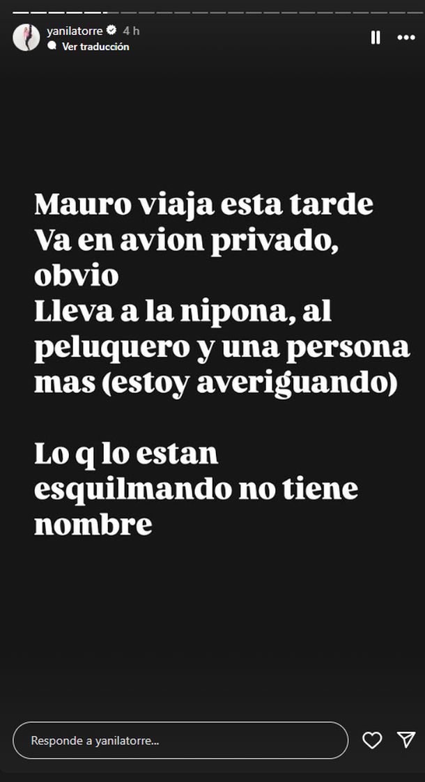 Por su parte, "Mauro viaja esta tarde. Va en avión privado, obvio", agregó Latorre antes de deslizar un detalle de su entorno: "lleva a la nipona, al peluquero y a una persona más", cuya identidad todavía no reveló.