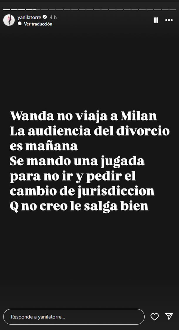 "Wanda no viaja a Milán. La audiencia del divorcio es mañana. Se mandó una jugada para no ir y pedir el cambio de jurisdicción, que no creo que le salga bien", explicó Yanina Latorre en sus historias de Instagram sobre el plan que probablemente haya sido implementado por el abogado de la rubia, Nicolás Payarolla, y su equipo.
