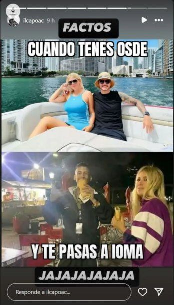 En la primera foto, la conductora está junto al futbolista en un yate con la leyenda “cuando tenés Osde”, en referencia a la prepaga; mientras que en la segunda la mediática aparece comiendo un choripán junto al músico con el texto “y te pasas a Ioma”. Además, sobre el meme, el mediático escribió “Factos” y compartió una risa burlona.