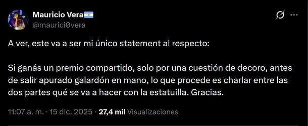 En este contexto, Mauricio Vera, conductor de Cabaret Voltaire, usó su cuenta de X para hablar de lo que ocurrió: "A ver, este va a ser mi único statement al respecto: Si ganás un premio compartido, solo por una cuestión de decoro, antes de salir apurado galardón en mano, lo que procede es charlar entre las dos partes qué se va a hacer con la estatuilla. Gracias", sostuvo.