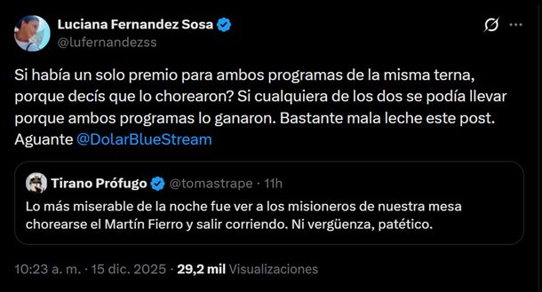 En medio de la controversia, la columnista Luciana Fernández Sosa salió en defensa Dólar Blue y cuestionó las acusaciones: "Si el premio era compartido, cualquiera de los dos podía llevarse la estatuilla. Bastante mala leche este post", afirmó, mensaje que fue replicado por el equipo del programa.
