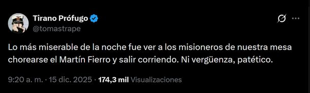 En la misma línea se manifestó Tomás Trapé, otro de los conductores del ciclo rosarino: "Lo más miserable de la noche fue ver a los misioneros de nuestra mesa chorearse el Martín Fierro y salir corriendo. Ni vergüenza, patético", expresó.