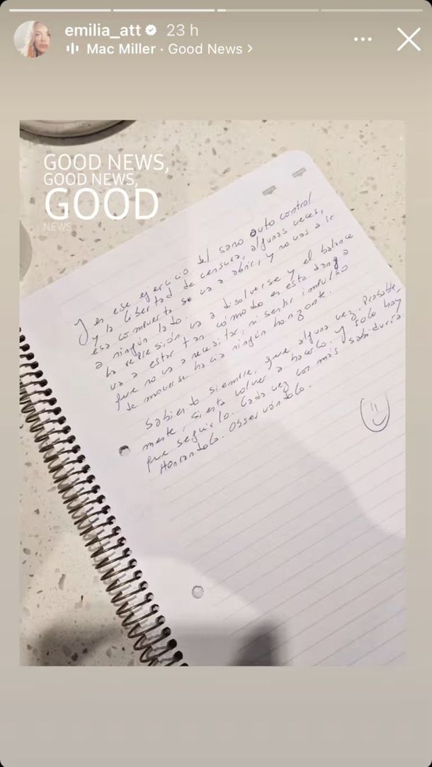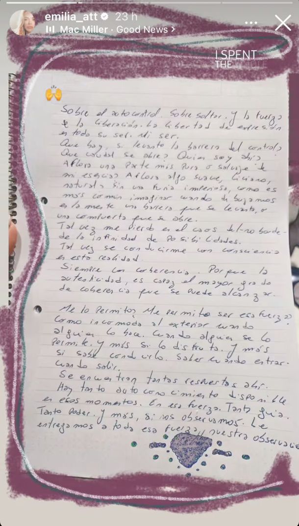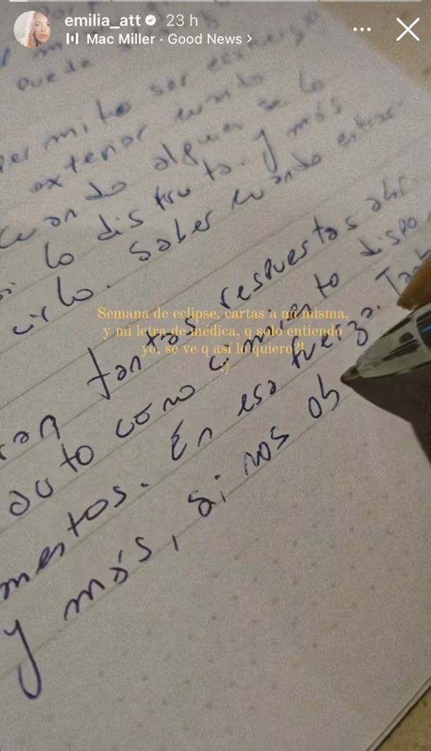 Attias en su escrito que compartió a través de la historias de Instagram arrancó escribiendo: "Semana de eclipse, cartas a mí misma y mi letra de médica, que solo entiendo yo, se ve que así lo quiero".