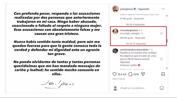 En el posteo de descargo que realizó el artista español, su esposa se expresó públicamente por primera vez luego de que se difundiera públicamente la acusación: "A tu lado siempre", escribió, mensaje al que Iglesias respondió al mensaje con un "me gusta".