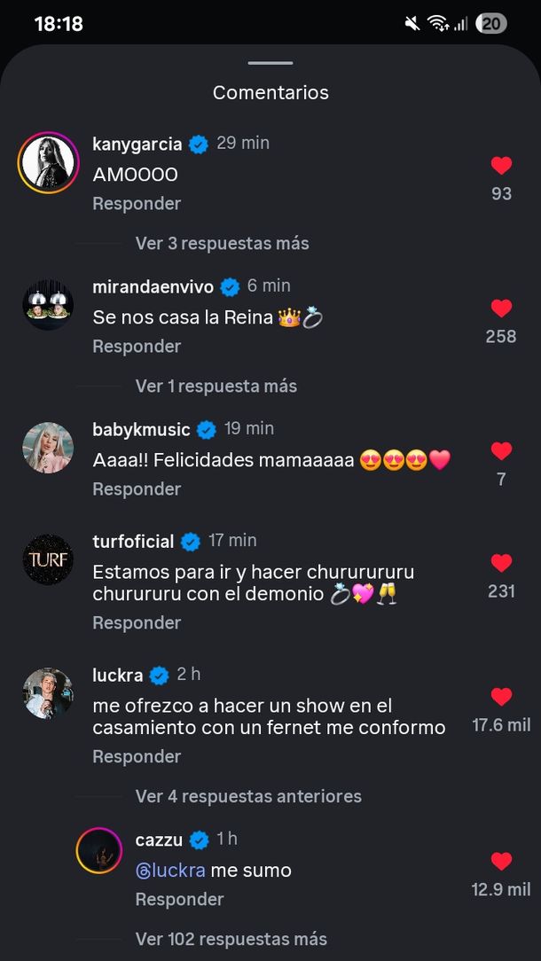 La celebración virtual sumó un toque de humor cuando Luck Ra se metió en los comentarios con una propuesta tan divertida como tentadora: “Me ofrezco a hacer un show en el casamiento, con un fernet me conformo”.
