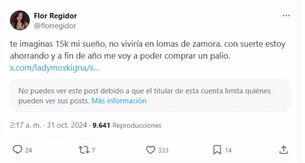 “Te imaginás 15 mil, mi sueño”, escribió la ex Gran Hermano este jueves por la madrugada en su perfil. “No viviría en Lomas de Zamora. Con suerte estoy ahorrando y a fin de año me voy a poder comprar un Palio”, dijo por el auto que desea tener antes de que termine el 2024.