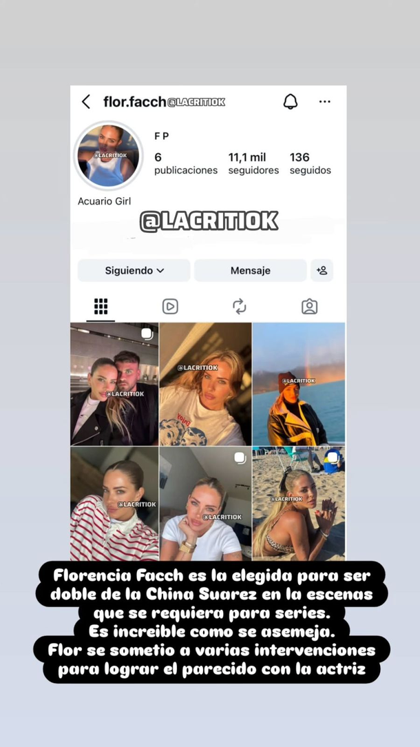 La información fue difundida por Najuel Saa, conocido en redes como “La Criti”, quien aseguró que Facch “es la elegida para ser doble de la China Suarez en la escenas que se requiera para series”. Acompañando sus palabras, compartió imágenes comparativas que potenciaron el debate y generaron miles de reacciones en cuestión de minutos.