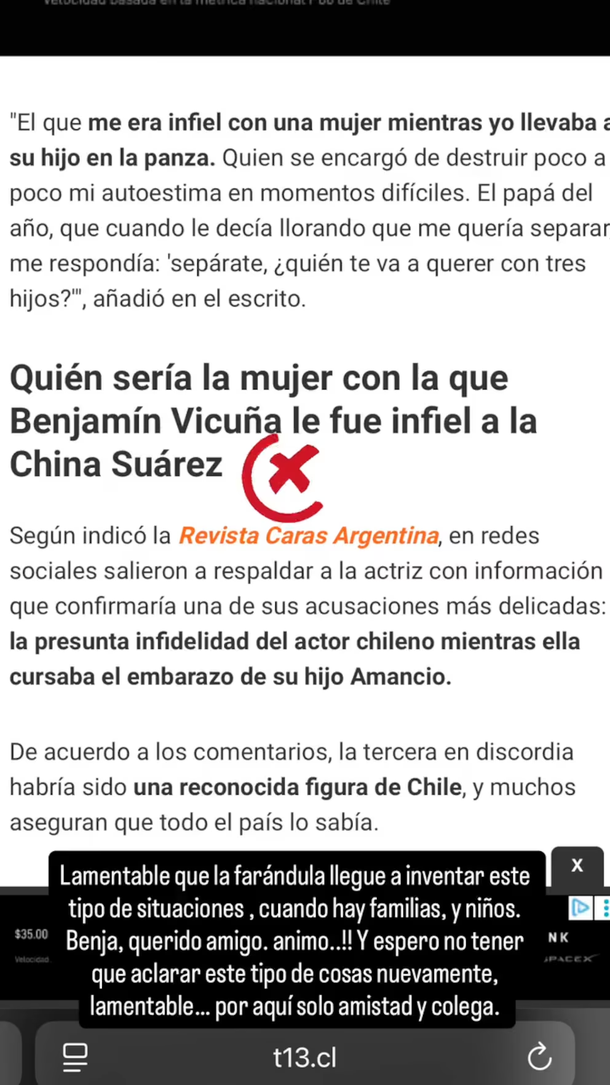 “Lamentable que la farándula llegue a inventar este tipo de situaciones, cuando hay familias y niños”, escribió en una historia de Instagram, donde además compartió una captura de una nota periodística que aludía a su supuesto romance con el actor. Y agregó un mensaje directo a su colega: “Benja, querido amigo, ánimo. Y espero no tener que aclarar este tipo de cosas nuevamente… lamentable, por aquí solamente amistad y colegas”.
