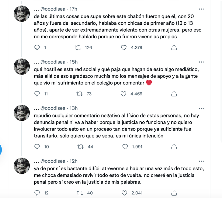 La otra denuncia grave es que "él, con 20 años y fuera del secundario, hablaba con chicas de primer año (12 o 13 años), aparte de ser extremadamente violento con otras mujeres, pero eso no me corresponde hablarlo porque no fueron vivencias propias".