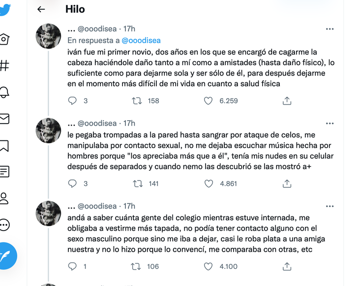 Luego contó detalles: "Le pegaba trompadas a la pared hasta sangrar por ataque de celos, me manipulaba por contacto sexual, no me dejaba escuchar música hecha por hombres porque los apreciaba más que a él, tenía mis nudes en su celular después de separados y cuando nemo las descubrió se las mostró a andá a saber cuánta gente del colegio mientras estuve internada".