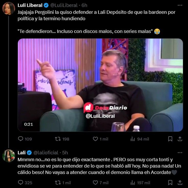 Tras esto, la nota tuvo muchísima repercusión en redes sociales y el mensaje de una internautas en X enfureció a la cantante, que no dudó en responderle. La usuaria @LuliLiberal escribió: "Jajajaja Pergolini la quiso defender a Lali Depósito de que la bardeen por política y la terminó hundiendo", comenzó indicando.