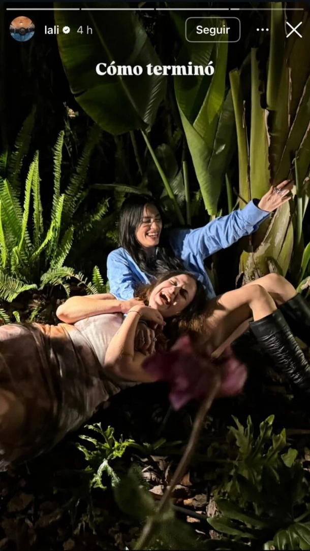 Horas más tarde, la artista publicó una segunda postal que tituló “Cómo terminó”. En ella, se la ve riendo a carcajadas junto a una amiga, relajadas en el pasto, entre hojas y plantas, reflejando el espíritu descontracturado del encuentro.