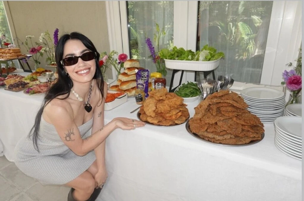 La celebración rápidamente acaparó la atención de los fanáticos debido a su enfoque culinario. En sus historias de Instagram, la cantante bromeó con la frase “Cómo empezó”, posando frente a una mesa repleta de comida casera. El detalle que más furor causó fue el banquete de milanesas: dos bandejas gigantes de filetes fritos, acompañadas por aderezos, lechuga y panes, en lo que fue rápidamente apodado una “milanga party”.