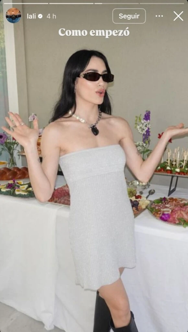 El evento tuvo lugar en una casa con jardín, creando un ambiente alegre y familiar. Lali optó por un look simple pero canchero, con un mini vestido strapless gris, botas negras y un llamativo collar con un corazón oscuro XL, que ya es un sello de su estilo atrevido y personal.