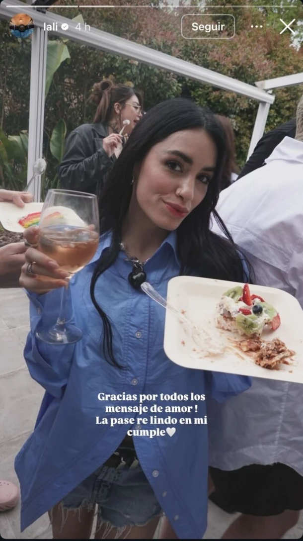 Lali, que viene de un año marcado por el éxito de su música y el inicio de nuevos proyectos actorales, se tomó un momento para agradecer el cariño de sus seguidores. En una historia final, levantó su copa junto a un plato de torta y escribió: “Gracias por todos los mensajes de amor. La pasé re lindo en mi cumple".