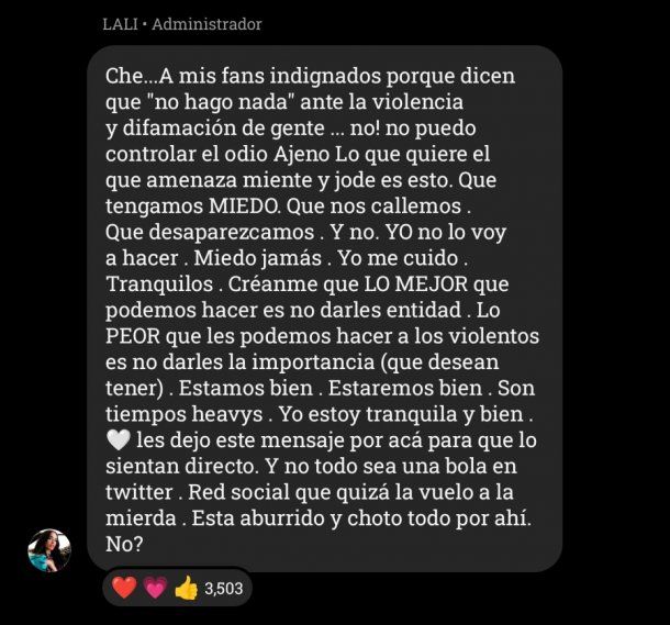 Y, agregó: "Lo que quiere el que amenaza, miente y jode es esto. Que tengamos MIEDO, que nos callemos, que desaparezcamos. Y no, yo no lo voy a hacer. Miedo, jamás . Yo me cuido. Tranquilos. Créanme que LO MEJOR que podemos hacer es no darles entidad. Lo PEOR que les podemos hacer a los violentos es no darles la importancia (que desean tener)"