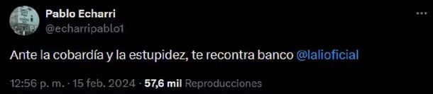 Mediante su cuenta de Twitter no se guardó nada y apuntó directamente contra Milei: “Ante la cobardía y la estupidez, te recontra banco, Lali”. Las palabras del actor fueron duramente replicadas por todos sus fanáticos y, a su vez, él mismo recibió el apoyo de los seguidores de la cantante quien, hasta el momento, no habló al respecto.
