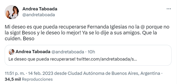"Mi deseo es que pueda recuperarse Fernanda Iglesias no la @ porque no la sigo! Besos y le deseo lo mejor! Ya se lo dije a sus amigos. Que la cuiden. Beso", sentenció.