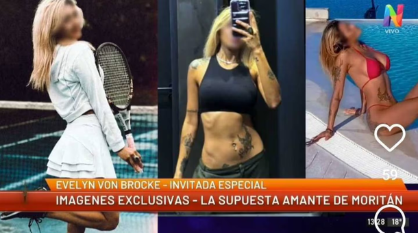 Fue este jueves cuando aparecieron las primeras imágenes de una de las tantas supuestas amantes de Moritán. Las postales fueron difundidas por Evelyn Von Brocke, quien en el programa de Gossip en Net, dio detalles de la mujer en cuestión. Aunque, más allá de la difusión de las fotos, le blurearon la cara porque "todavía no quiere salir a hablar públicamente", según explicaron.