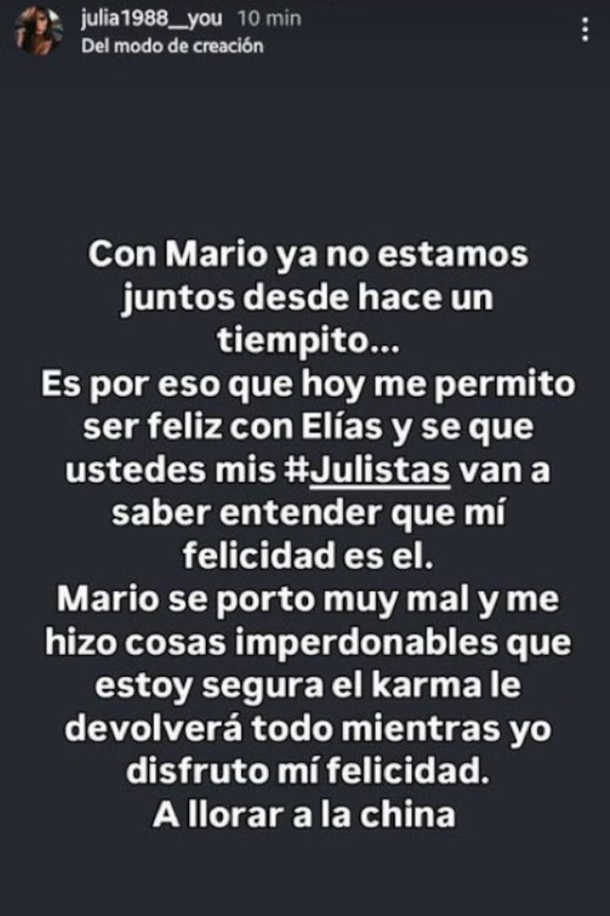 “Mario se portó muy mal y me hizo cosas imperdonables... el karma le va a devolver todo mientras yo disfruto de mi felicidad”, reza el posteo.