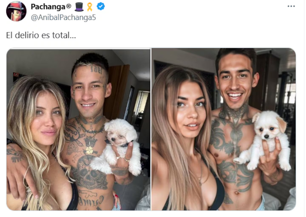 El texto no fue lo único llamativo. Poco después, la cuenta publicó una imagen alterada con inteligencia artificial en la que aparece la figura de Wanda junto a L-Gante, lo que para muchos terminó de confirmar la identidad detrás del perfil. La publicación fue compartida rápidamente por la cuenta de X @elejercitodelam, lo que alimentó aún más la polémica en redes.