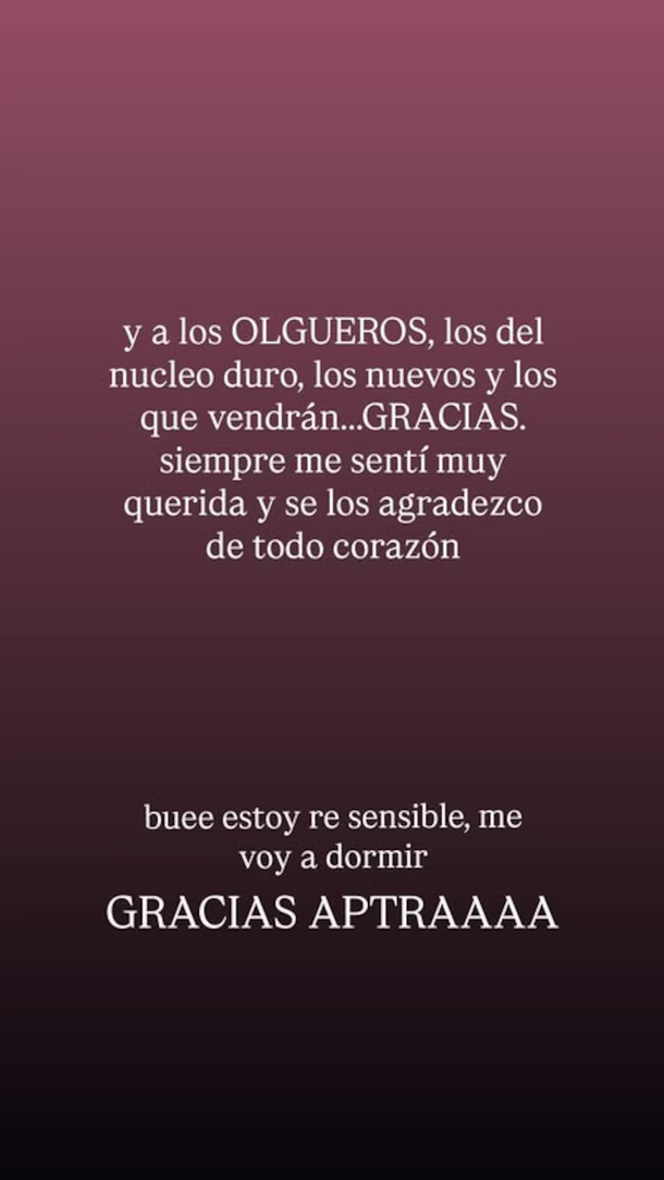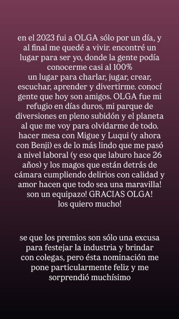 La actriz detalló con sensibilidad lo que el espacio de streaming significó en un año marcado por la separación: “En el 2023 fui a Olga sólo por un día y al final me quedé a vivir. Encontré un lugar para ser yo, donde la gente podía conocerme casi al 100%, un lugar para charlar, jugar, crear, escuchar, aprender y divertirme. Conocí gente que hoy son amigos".