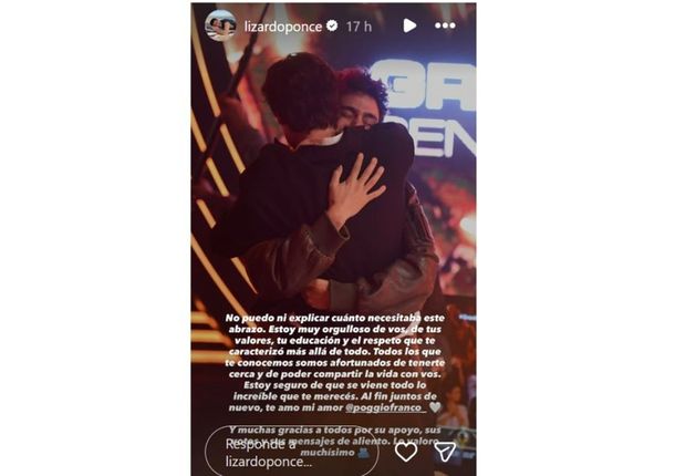 La emotiva escena quedó registrada en una fotografía que Ponce compartió en sus redes sociales, acompañada del mensaje: "No puedo ni explicar cuánto necesitaba este abrazo. Estoy muy orgulloso de vos, de tus valores, tu educación y el respeto que te caracterizó más allá de todo".