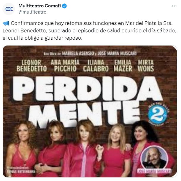 Debido a su ACV, Leonor Benedetto fue internada rápidamente, pero el mismo domingo ya fue dada de alta y se encontraba en condiciones de regresar a sus funciones. No obstante, mantuvo reposo hasta este martes, cuando oficialmente se le permitió regresar a los escenarios para volver a ocupar su rol en la obra de Muscari.