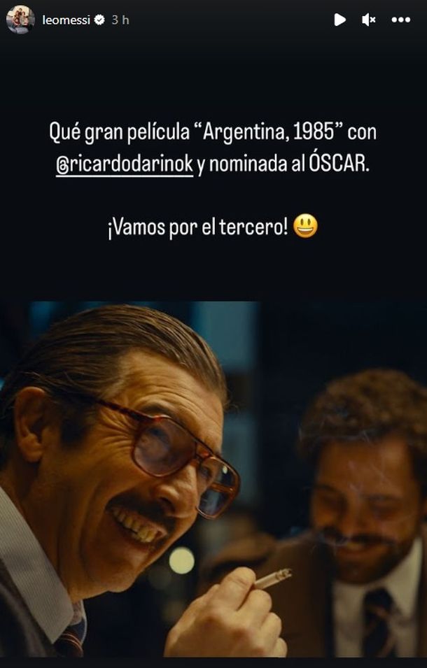 "Que gran película “Argentina, 1985” con @ricardodarinok y nominada al ÓSCAR. ¡Vamos por el tercero!”, posteó Messi en una historia de Instagram.