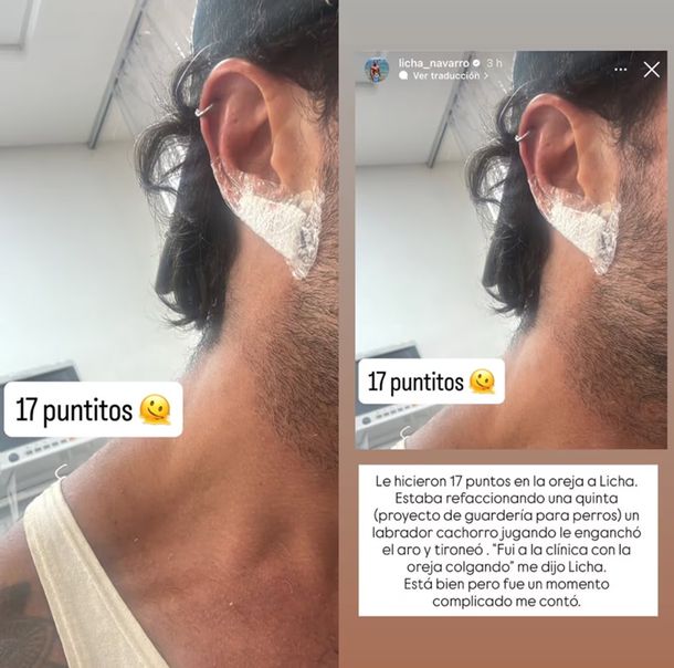 “Le hicieron 17 puntos en la oreja a Licha. Estaba refaccionando una quinta (proyecto de guardería para perros), un labrador cachorro jugando le enganchó el aro y tironeó. ‘Fui a la clínica con la oreja colgando’ me dijo Licha. Está bien, pero fue un momento complicado me contó”, relató el comunicador.