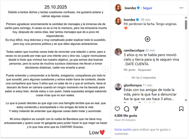 Tras el infierno que le tocó vivir junto a su expareja Leandro García Gómez, a quien aún defiende, Lourdes Fernández de Bandana lanzó un extenso comunicado en su cuenta de Instagram "debido a tantos dichos y tantas cuestiones confusas", con el fin de "aclarar y calmar algunas cosas".
