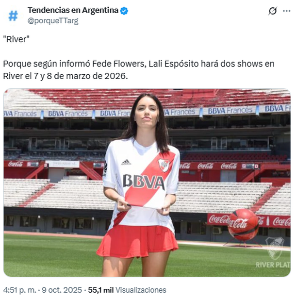 El periodista Fede Flowers lanzó una primicia e hizo estallar a los fans de Lali Espósito: según el comunicador, la intérprete de "Fanático" realizará dos shows en River en el año 2026 y, aunque todavía no se conocen mayores detalles, las fechas indicadas son el 7 y 8 de marzo.