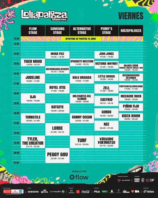 Lollapalooza Argentina 2026: grilla hora por hora del viernes 13 de marzo