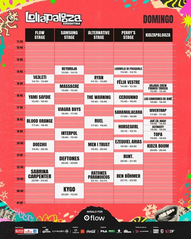 Escenario FLOW: 143leti, de 14.15 a 15.00. Yami Safdie, de 15.45 a 16.45. Blood Orange, de 17.45 a 18.45. Doechii, de 19.45 a 20.45. Sabrina Carpenter, de 22.00 a 23.20.