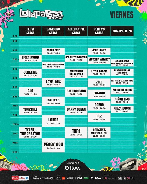 Escenario FLOW: Tiger Mood, de 14.30 a 15.15. Judeline, de 16.00 a 17.00. DJO, de 18.00 a 19.00. Turnstile, de 20.00 a 21.00. Tyler, The Creator, de 22.15 a 23.30.