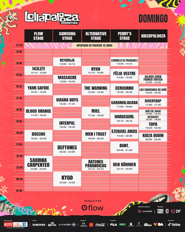 Para la jornada final del domingo 15 de marzo, el festival propone un cierre de contrastes, uniendo el pop actual de Sabrina Carpenter con la potencia de Deftones. La cuota de rock nacional histórico estará a cargo de los Ratones Paranoicos, en una jornada que también incluye a Doechii, Kygo, Interpol y Ben Böhmer.