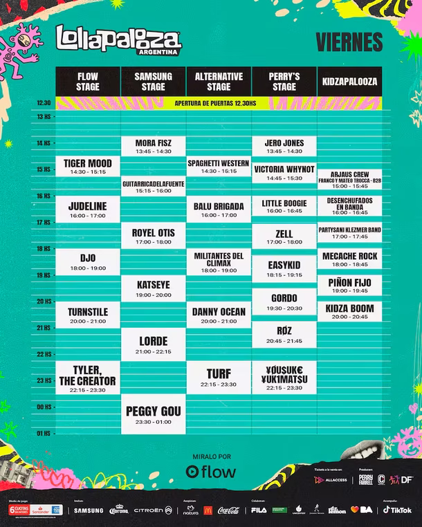 La jornada inaugural del viernes estará marcada por una fuerte presencia de sonidos alternativos y vanguardistas. Los nombres principales que encabezan esta fecha son Tyler, The Creator y Lorde, quienes estarán acompañados por una lista heterogénea que incluye a: