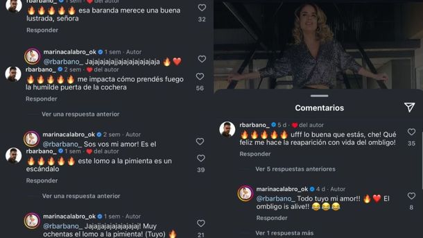 Ahí, el periodista comentó: "Uff lo buena que estás che. Que feliz me hace la reaparición en vida del ombligo", recibiendo como respuesta: "Todo tuyo mi amor. El ombligo is alive (está vivo)". Esta no fue la única vez que Calabró se tomó una foto en ese mismo lugar, por eso su pareja manifestó: "Esa baranda merece una buena lustrada, señora".