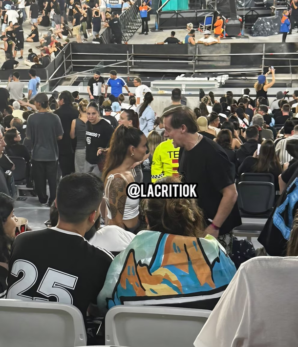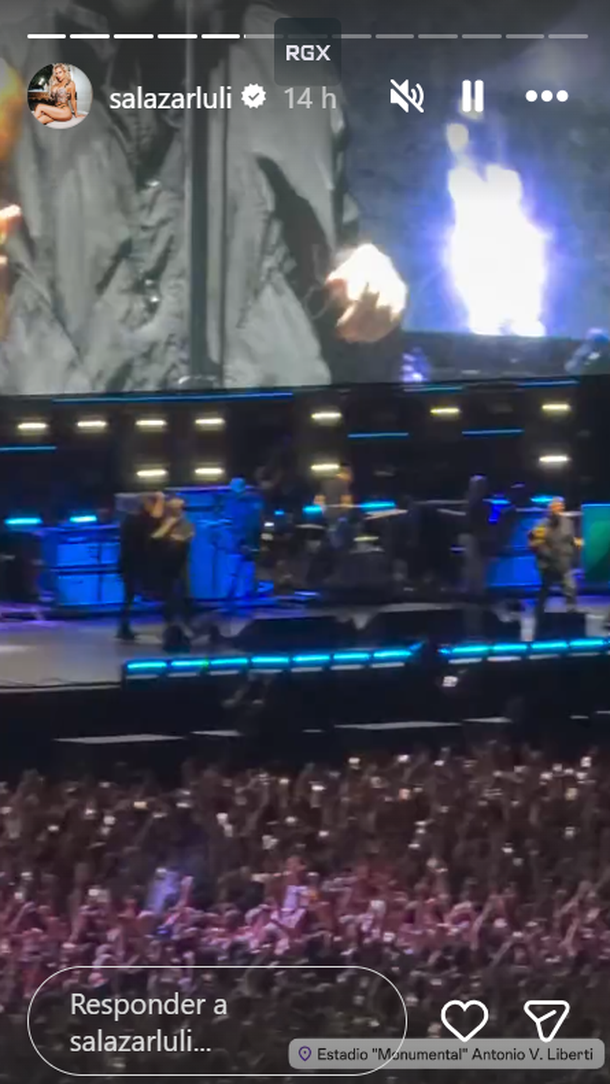 Por su parte, Luciana Salazar se mostró sumamente entusiasmada, siguiendo gran parte del concierto desde la tribuna. La modelo se grabó cantando y luciendo un look compuesto por un sombrero negro de ala curva que cubría su pelo rubio lacio, junto a una prenda de tirantes oscuros con textura brillante.