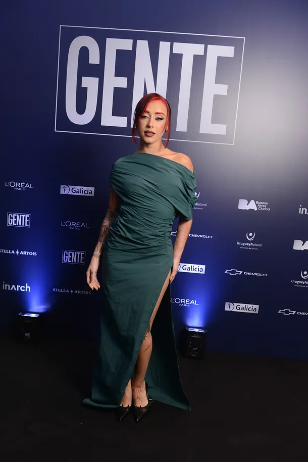 Tuli Acosta, la última ganadora del Bailando sobresalió en la alfombra azul con un look diferente. Es que asistió a la gala de los Personajes del Año 2024 con un vestido propio, verde largo, al cuerpo, con un hombro al descubierto y un tajo en la pierna izquierda, que deja al descubierto los zapatos negros de Sarkany.